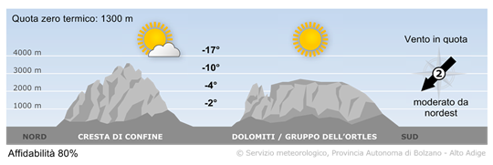 Tempo molto soleggiato con cielo generalmente sereno. Venti da nord in attenuazione. Temperature minime tra -15° e -2°, massime tra -1° e +7°.